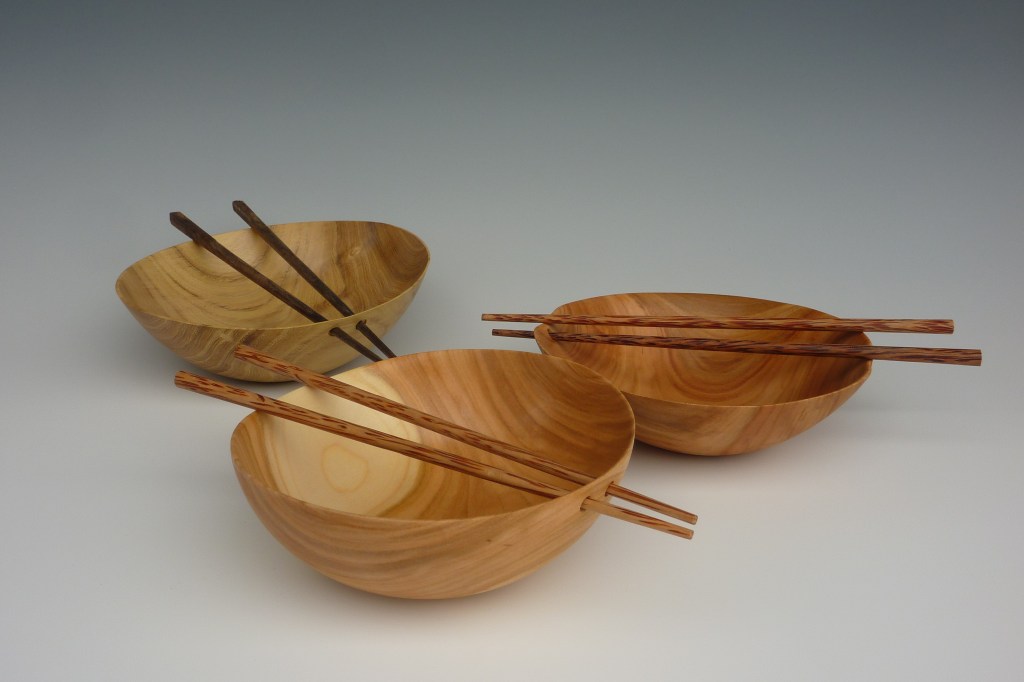 C’est dans un mas reculé de la commune de Chamborigaud, pays de Jean-Pierre Chabrol, que je fabrique de la vaisselle à partir de bois régionaux, tournés vert. Je profite ainsi des déformations naturelles, donnant à chaque objet une forme unique que je ne maîtrise pas. Je prends le bois le plus près possible de mon domicile, j’essaye ainsi de valoriser les essences de chez nous, comme le châtaignier, l’acacia, le micocoulier, le frêne, tous les fruitiers et bien d’autres. J’ai une finition alimentaire à base d’huile de tournesol et de cire d’abeille. La vaisselle en bois est très rustique et solide, j’essaye de l’alléger un maximum en tournant le plus fin possible, jusqu’à la transparence quand cela est faisable.